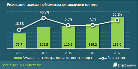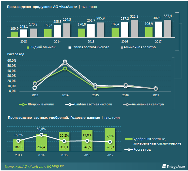 Впрочем, в 2017 году показатели были выше, чем в прошлом: по сведениям АО «КазАзот», компания произвела 197 тыс. тонн жидкого аммиака, 337 тыс. тонн аммиачной селитры, 303 тыс. тонн слабой азотной кислоты, увеличив производство своих продуктов на 5% за год.