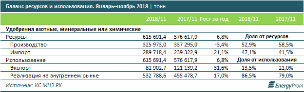 Впрочем, пока по итогам января–ноября 2018 года казахстанское производство обеспечило всего 52,9% спроса на азотные удобрения, против почти 59% годом ранее. На фоне пусть и незначительного спада местного выпуска активизировались импортёры: объёмы импорта выросли сразу на 21,1% год-к-году.