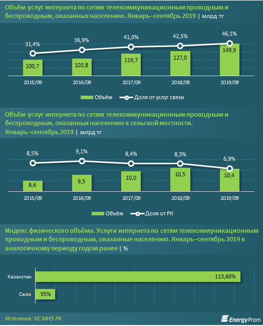 Индекс физического объёма услуг интернет-провайдеров по РК составил 113,6%, в то время как в сельской местности — 95%.
