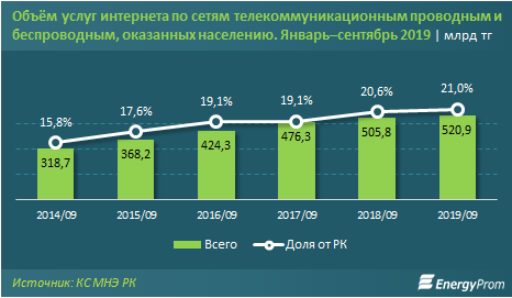 Объём услуг связи, оказанных населению за январь–сентябрь 2019 года, достиг 325,4 млрд тг, индекс физического объёма к аналогичному периоду прошлого года составил 105,5%. Почти половина всего объёма услуг в секторе, оказанных населению, приходится на обеспечение интернет-доступа по проводным и беспроводным телекоммуникационным сетям: 149,9 млрд тг, или 46,1%.