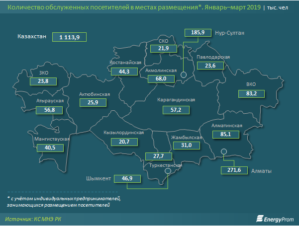 Наибольшее количество посетителей пришлось на Алматы (271,6 тыс. человек), Нур-Султан (185,9 тыс. человек) и Алматинскую область (85,1 тыс. человек).