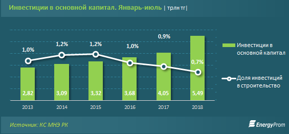 Совокупные инвестиции в основной капитал за январь-июль 2018 года выросли сразу на 1,4 трлн тг по отношению к аналогичному периоду годом ранее, и составили 5,5 трлн тг.