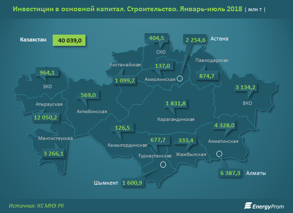 В разрезе регионов, основные инвестиции в строительство сконцентрированы в Атырауской области — 30,1% от всех инвестиций в секторе (12,05 млрд тг).
