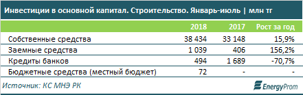 Главный источник финансирования строительного сектора — собственные средства компаний (96%). За январь-июль текущего года за счет собственных средств было проинвестированно 38,4 млрд тг (прирост — 15,9%).