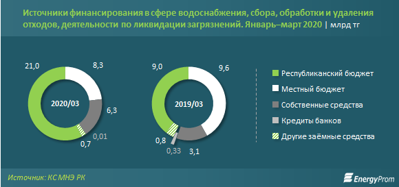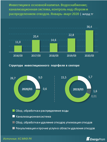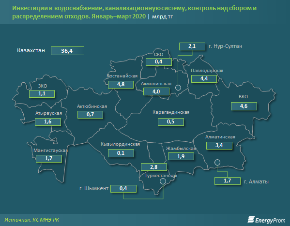 Объём капитальных инвестиций в водоснабжение, канализационную систему, контроль над сбором и распределением отходов за январь–март 2020 года достиг 36,4 млрд тг — на 59,2% больше, чем в прошлом году. ИФО к соответствующему периоду прошлого года составил 157%.