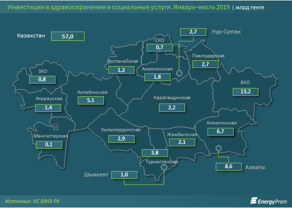 По итогам семи месяцев 2019 года объём инвестиций в здравоохранение и социальные услуги увеличился на 12,7% и составил 57 млрд тг (ИФО — 110,7%). За аналогичный период прошлого года сумма инвестиций была равна 50,6 млрд тг, рост составлял 54,8% (ИФО — 147%). Рост инвестиций в аналогичном периоде наблюдается третий год подряд.