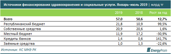 Основным источником инвестиций в сферу здравоохранения и социальных услуг является республиканский бюджет: за январь–июль текущего года в сектор было направлено уже 21,8 млрд тг (годом ранее — 10,9 млрд тг).