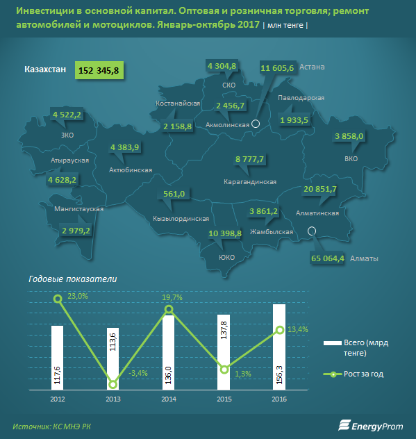Наибольший объем инвестиций пришелся на финансовый центр, Алматы — 65,1 млрд тг, +17,5% за год. На столицу приходится сразу 28% розничной и 51% оптовой торговли по РК за январь-октябрь 2017.