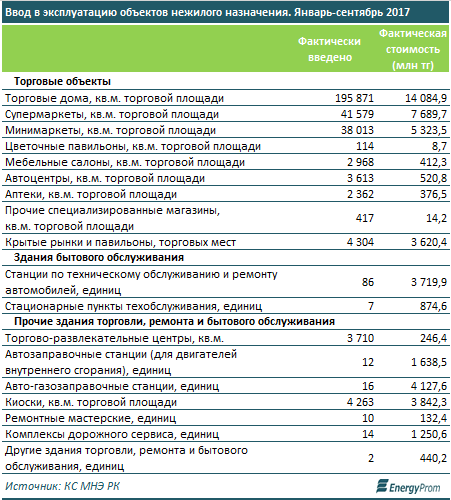 По итогам трех кварталов в РК сдали в эксплуатацию торговые объекты на 32,1 млрд тг. Из них торговые дома заняли 14,1 млрд тг — это 195,9 тысяч кв м торговой площади. Еще 7,7 млрд тг — это супермаркеты, где сданы 41,6 тыс. квадратов торговых площадей, и 5,3 млрд тг — минимаркеты, сданы 38 тыс. кв м площадей.