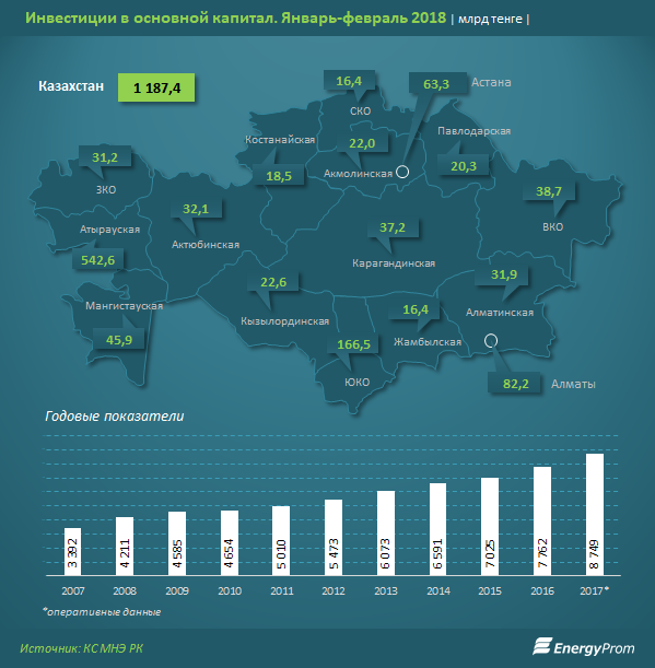 Среди регионов ключевой инвестмагнит — нефтяная Атырауская область, в которую проинвестировано 45,7% от общего объема капвложений: 542,6 млрд тг, в 2,3 раза больше, чем годом ранее.