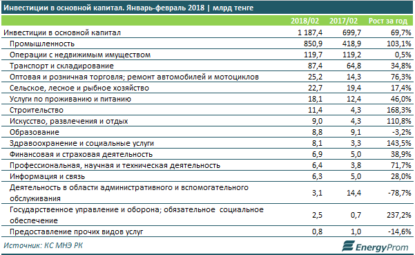 По итогам 2 месяцев текущего года объем инвестиций в основной капитал составил 1,29 трлн тг — сразу на 69,7% больше, чем годом ранее.