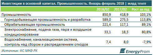 Самая инвестоемкая сфера — промсектор, в который направлено 71,7% от общего портфеля инвестиций в основной капитал: 850,9 млрд тг, вдвое больше, чем годом ранее.