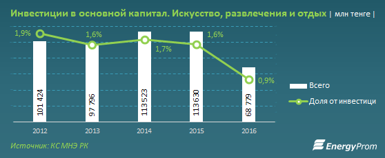 Доля инвестиций в искусство и развлечения составила по итогам прошлого года всего 0,9% от всего объема капвложений по РК, против 1,6-1,7% в 2015-2014 годах и почти 2% — в 2012 году.