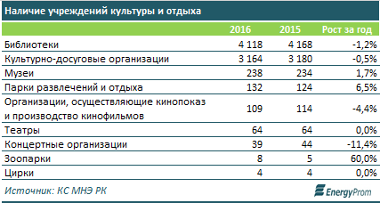 К началу текущего года по РК заметно увеличилось год-к-году число зоопарков (на 60%, до 8), также прибавилось парков развлечений и отдыха (на 6,5%, до 132) и музеев (на 1,7%, до 238).