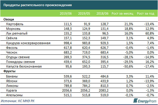 За июнь 2019 года в супермаркетах и на базарах резко подорожали новые в этом сезоне овощи — картофель, морковь и репчатый лук — на 21,3%, 18,8% и 16% соответственно. Цены на свёклу выросли на 3,1% за месяц.
