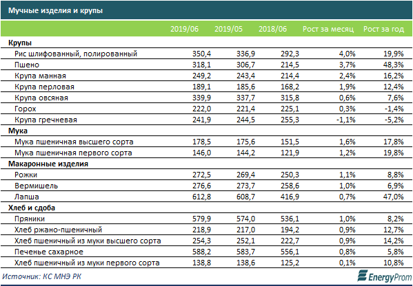 Среди круп за июнь на 4% вырос в цене рис, на 3,7% — пшено; цены на манную крупу увеличились на 2,4%. Пшеничная мука высшего сорта подорожала на 1,6% за месяц, первого сорта — на 1,2%.
