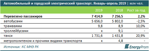 За январь–апрель текущего года перевозки пассажиров автомобильным и городским электрическим транспортом составили 7,4 млрд человек — на 2,2% больше, чем в аналогичном периоде годом ранее.