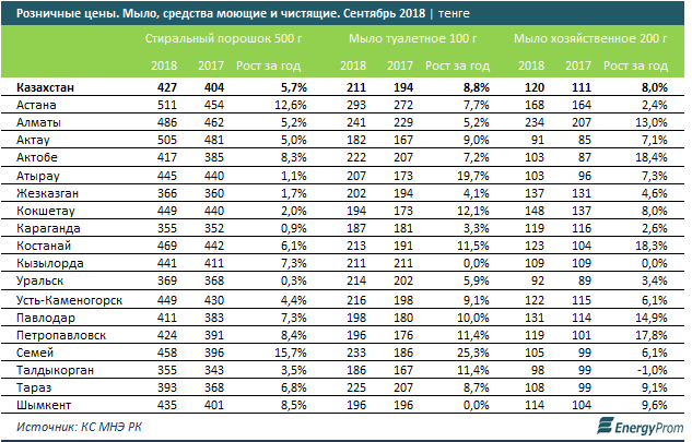 Среди туалетных средств к октябрю зубная паста подорожала год-к-году на 8,3%, до 469 тг за 75 мл в среднем по РК, шампунь — на 6,2%, до 392 тг за флакон в 150 мл.