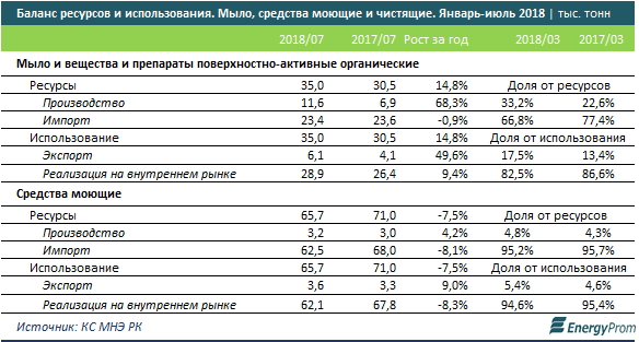 Примечательно, что если производство мыла в РК заметно выросло (по итогам 7 месяцев — 11,6 тыс. тонн — сразу на 68,3% больше, чем год назад), и это уже 33,2% от спроса, против 22,6% в январе-июле 2017, то с моющими средствами — картина иная.
