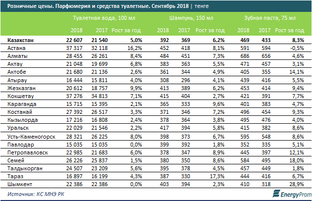Туалетная вода выросла в цене на 5% за год, до 22,6 тысячи тенге на 100 мл.