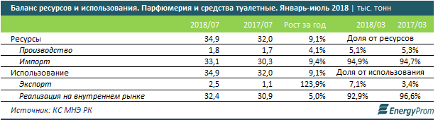 Рынок парфюмерии и туалетных средств также полностью во власти импорта. Так, собственное производство обеспечило лишь 5,1% спроса — это 1,8 тыс. тонн продукции за январь-июль текущего года, лишь на 4,1% больше, чем годом ранее.