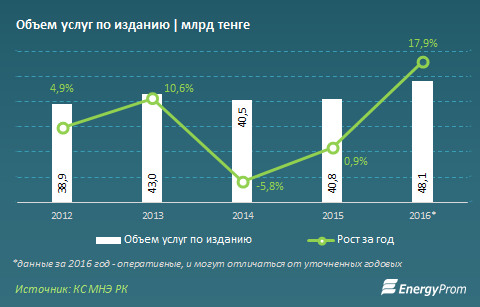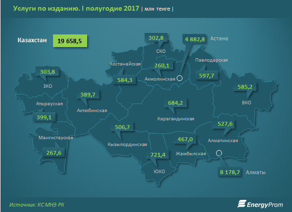 На втором месте — издательства Астаны: 4,88 млрд тг, однако здесь, напротив, отмечен значительный спад объемов услуг в секторе — сразу минус 12,5% за год.
