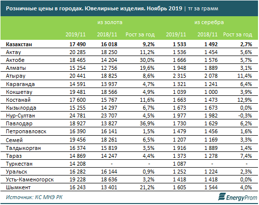 Серебряные ювелирные изделия подорожали на 2,7% за год, до 1,5 тыс. тг по итогам ноября 2019-го. Дороже всего они стоили в Атырау (2,3 тыс. тг, плюс 11,4% за год), Нур-Султане (2 тыс. тг, минус 0,3% за год) и Алматы (1,9 тыс. тг, плюс 3,1% за год).