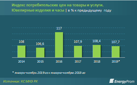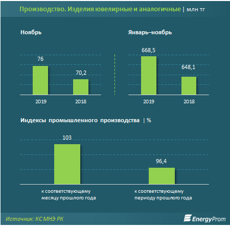 По итогам 11 месяцев в стране произвели ювелирных изделий на 668,5 млн тг, против 648,1 млн тг годом ранее. Впрочем, по данным Комитета по статистике, индекс промышленного производства в секторе составил всего 96,4%, что говорит о спаде выпуска в реальном выражении.