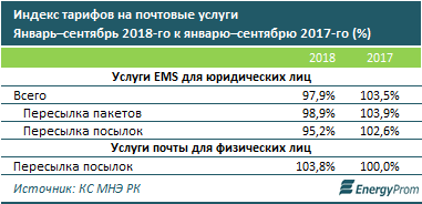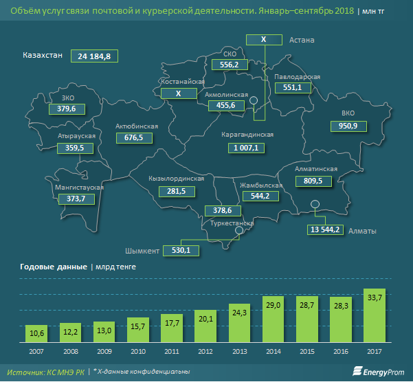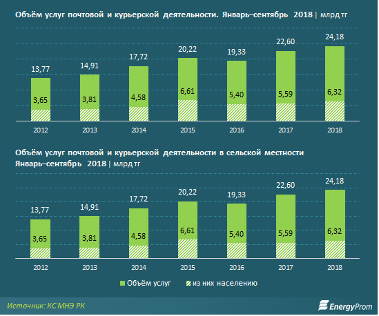 За 9 месяцев текущего года объём услуг почтовой и курьерской деятельности достиг 24,2 млрд тг, что на 7% больше, чем в аналогичном периоде 2017-го.