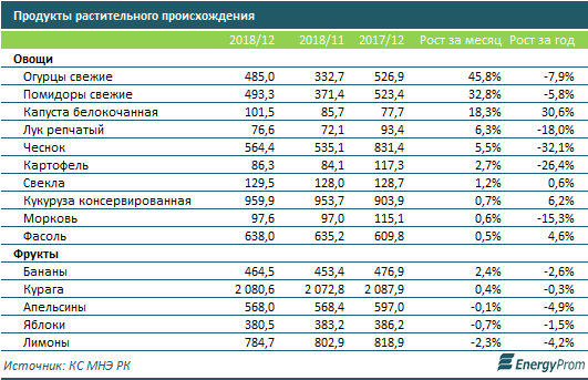 По итогам декабря 2018 года в супермаркетах и на базарах РК резко подорожали огурцы и помидоры — на 45,8% и 32,8% соответственно. Удорожание ожидаемо: в зимний сезон свежие овощи — либо привозные, либо тепличные. Поднялись также цены на капусту — на 18,3%.
