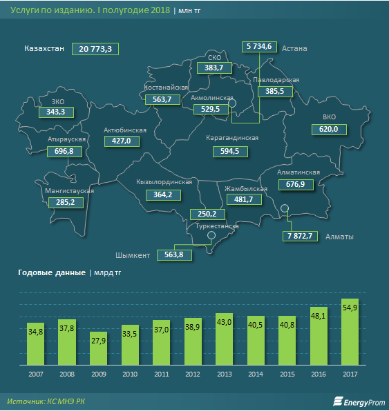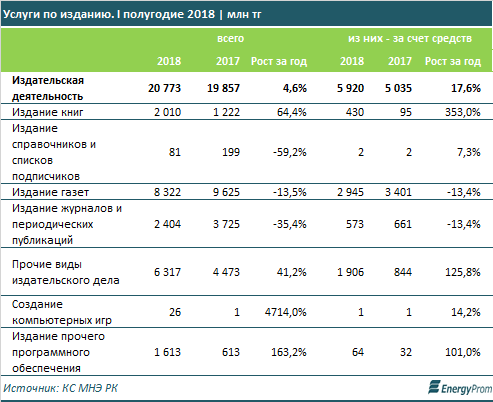 В I полугодии издательские услуги составили 20,7 миллиардов тенге — на 4,6% больше, чем годом ранее.