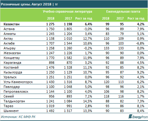 Еженедельные газеты по итогам августа обходились в среднем в 99 тг, на 4,2% больше, чем годом ранее.