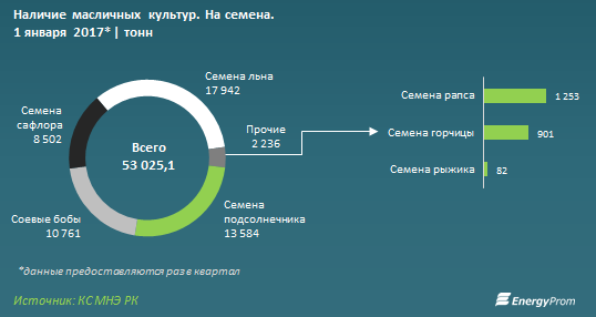 Наличие масличных культур к началу текущего года также показало годовой прирост (+15,3%) — до 1,15 млн тонн. Из них на семена предназначены 53,03 тысячи тонн — на 6,6% больше, чем годом ранее.
