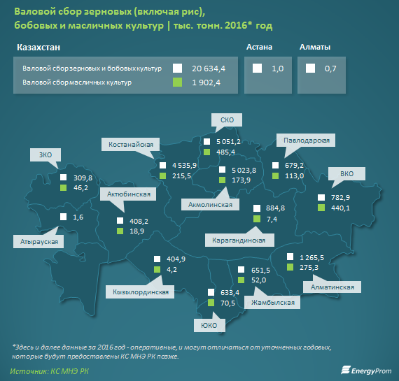 По валовому сбору зерновых и бобовых, традиционно, лидируют главные житницы страны — СКО, Акмолинская и Костанайская области, по сбору масличных — СКО, ВКО, и Алматинская область.