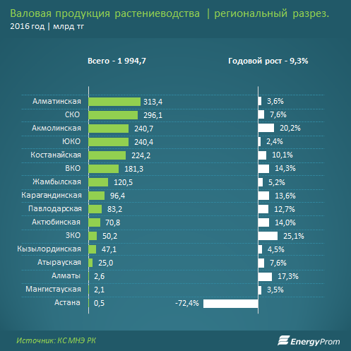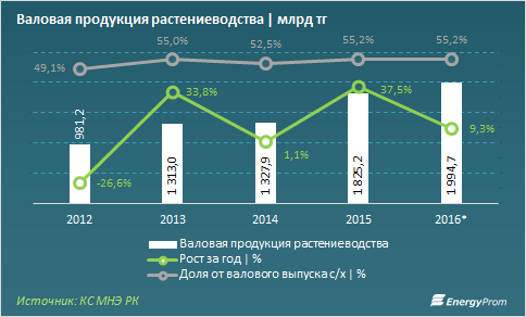 В стоимостном выражении валовая продукция растениеводства достигла по итогам 2016 года 1,99 трлн тг — на 9,3% больше, чем в 2015.