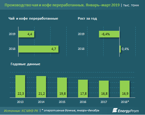 За I квартал производство чая и кофе составило лишь 4,4 тыс. тонн — сразу на 6,4% меньше, чем в аналогичном периоде годом ранее. Основная доля производства (91,3%) приходится на Алматы — 4 тыс. тонн. Здесь работают такие компании по переработке чая и кофе, как, например, ТОО «Tea Нouse» («Ассам», «Симба», «Наурыз», «Индира», «Тенгри», «Тамаша», Sunday) и филиал Tealand, ТОО «RG Brands Kazakhstan» («Пиала»).