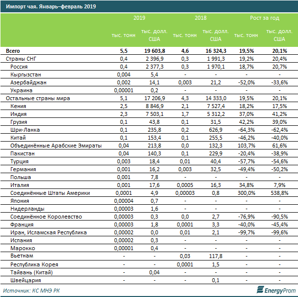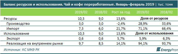За январь–февраль 2019 года импорт любимого казахстанцами напитка составил 5,5 тыс. тонн (+19,5% за год), или 19,6 млн долл. США (+20,1% за год).