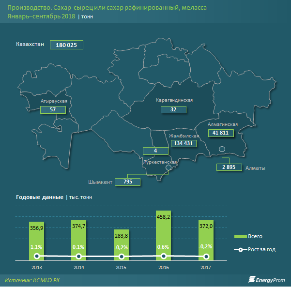 По традиции, наибольший объём выпуска сконцентрирован в Жамбылской области (74,7%). Впрочем, здесь производство снизилось на вызывающие пессимистичный настрой 32,3% за год и составило лишь 134,4 тысячи тонн. В регионе работают два филиала крупнейшего предприятия отрасти — Центральноазиатской сахарной корпорации — Таразский и Меркенский. Головной офис ЦАСК находится в Алматы.