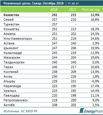 К ноябрю розничные цены на сахар выросли до 241,2 тенге, это сразу на 11,9% больше, чем годом ранее.