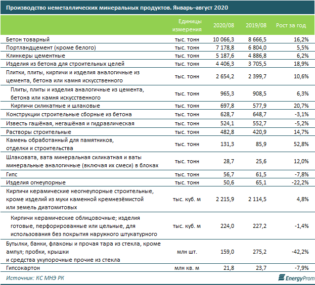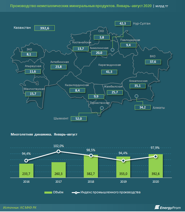 Производство строительных материалов и прочих минеральных изделий за январь–август 2020 года в денежном выражении достигло 392,6 млрд тг— на 10,6% больше по сравнению с аналогичным периодом прошлого года. В то же время индекс промышленного производства составил всего 97,9%, что указывает на спад реальных объёмов выпуска в секторе.