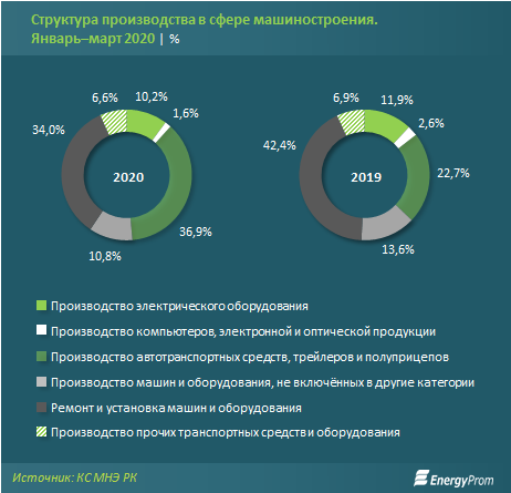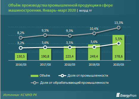 Машиностроение в РК, несмотря на чрезвычайное положение в стране, продолжает развиваться. За январь–март 2020 года выпуск продукции в сфере машиностроения в денежном выражении достиг 378,6 млрд тг — на 51,8% больше, чем в прошлом году. Индекс промышленного производства к аналогичному периоду прошлого года составил сразу 130,4%.