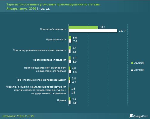 Почти три четверти правонарушений приходится на правонарушения против собственности: 83,2 тыс. — на 39,6% меньше, чем в прошлом году.