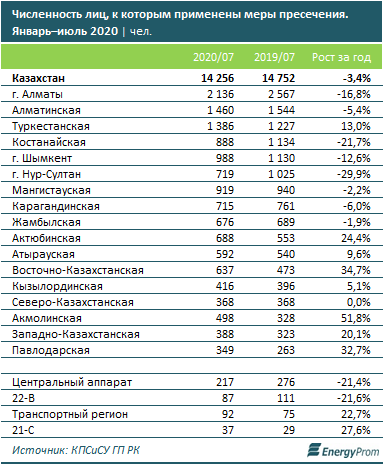 В региональном разрезе наибольшее число тех, к кому применили меры пресечения, зафиксировано в Алматы: 2,1 тыс. человек, минус 16,8% за год. Далее идут Алматинская (1,5 тыс. человек) и Туркестанская (1,4 тыс. человек) области.