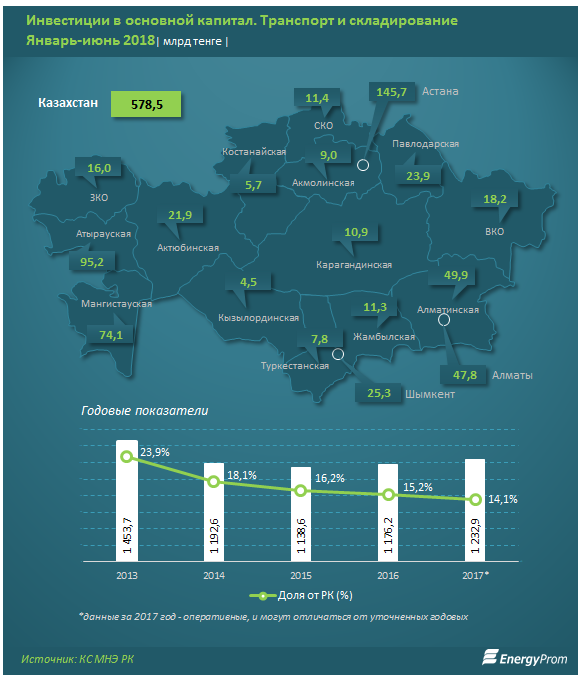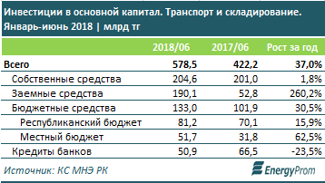 В сферу транспорта и складирования РК за январь-июнь 2018 инвестировали 578,5 млрд тг — на 37% больше, чем годом ранее. С учетом инфляции, рост в сопоставимых ценах составил 30,1%.