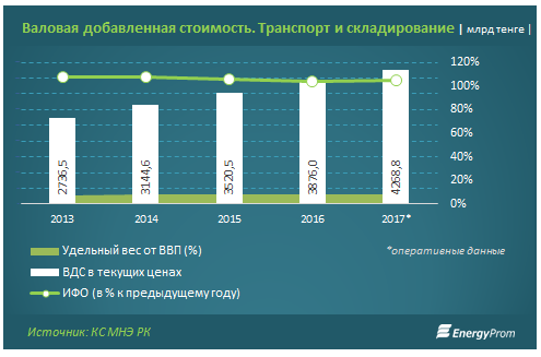 Транспортно-логистическая сфера демонстрирует уверенный рост. Так, по итогам прошлого года валовая добавленная стоимость инфраструктурной отрасли достигла 4,3 трлн тг — это 8,2% от ВВП РК.