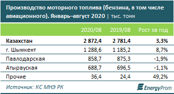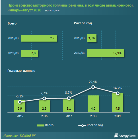 За январь–август 2020 года НПЗ Казахстана произвели 2,9 млн тонн бензина, включая авиационный — на 3,3% больше, чем в прошлом году.