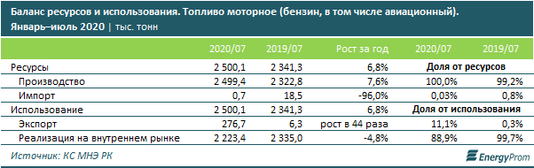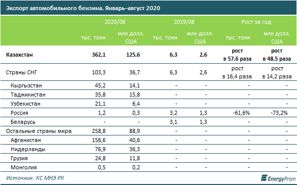 За январь–август 2020 года компании экспортировали 362,1 тыс. тонн автомобильного бензина, против всего 6,3 тыс. тонн в аналогичном периоде годом ранее (рост в 57,6 раза). В деньгах экспорт составил 125,6 млн долл. США — в 48,5 раза больше, чем в прошлом году.