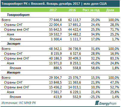 Примечательно, что рост обеспечен усилением экспортного направления — так, поставки на рынок Японии выросли за год сразу на 58,6%, это 1,8% от всего экспорта РК, против 1,5% годом ранее.