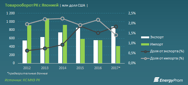Среди ключевых экспортных позиций РК на японский рынок в 2017 году — ферросплавы (на 534,3 млн долл), и нефть и нефтепродукты сырые (на 339,4 млн долл). На эти 2 позиции пришлось 98,6% всего экспорта в Страну восходящего солнца.