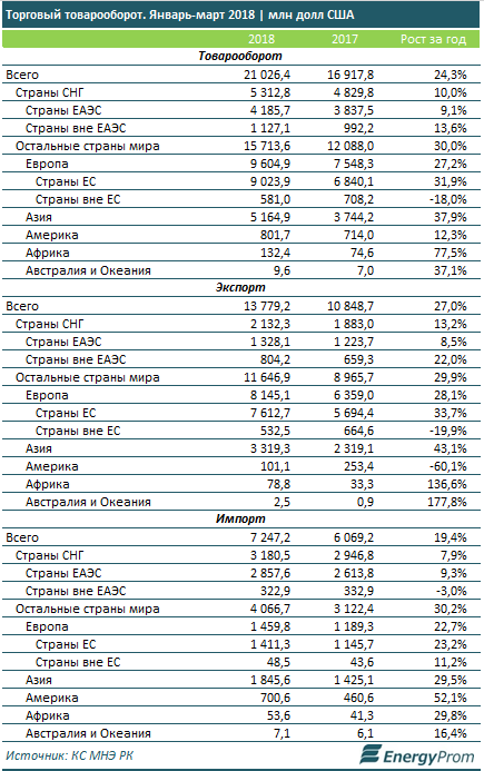 Внешнеторговый товарооборот РК увеличился год-к-году на 24,3%, до 21 млрд долларов США по итогам I квартала текущего года.